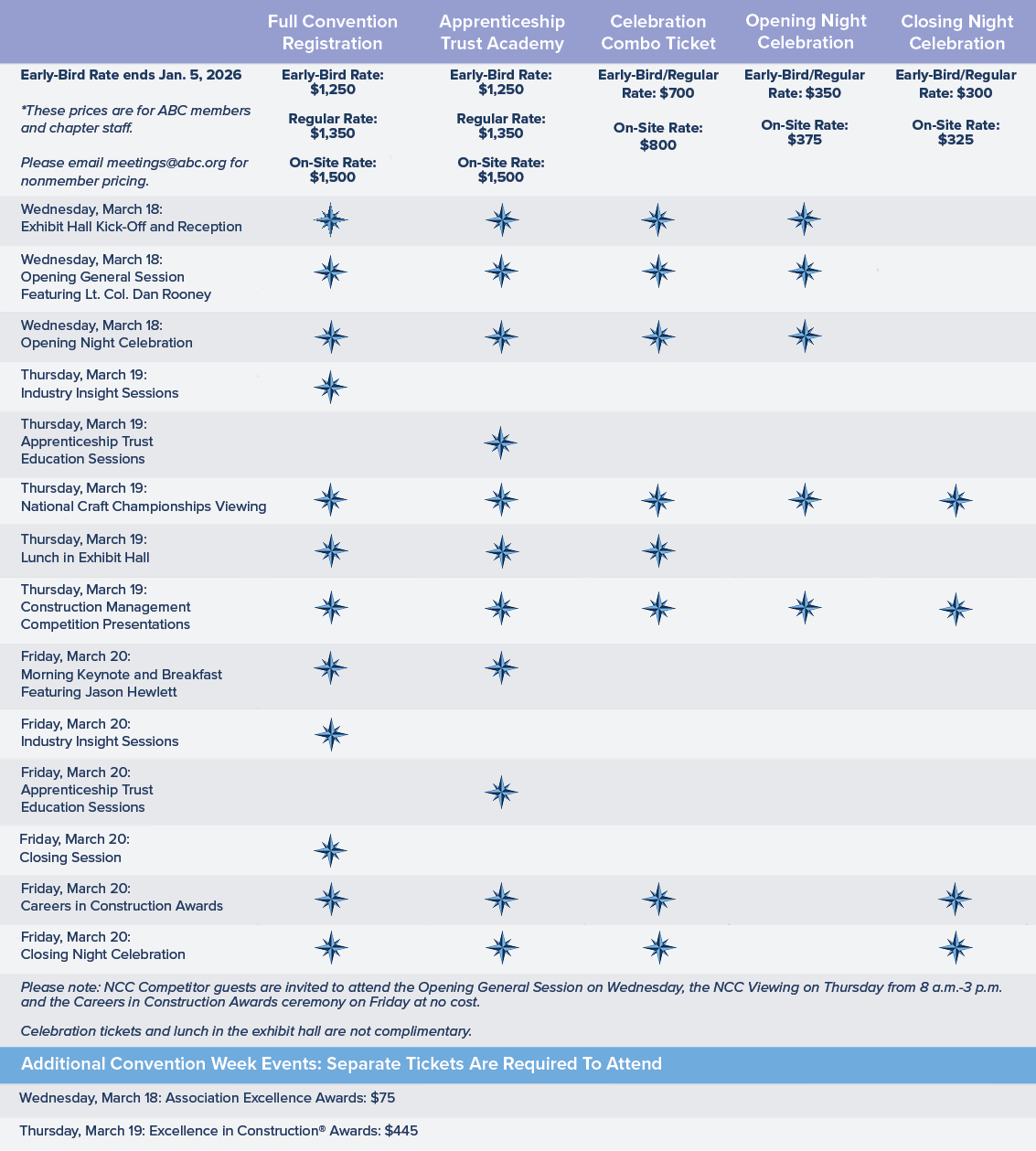 Registration for ABC Convention 2026 is open to ABC members and nonmembers sponsored by ABC or one of its chapters or members, subject to ABC approval. Advance registration for nonmembers is required and closes Feb. 16, 2026.